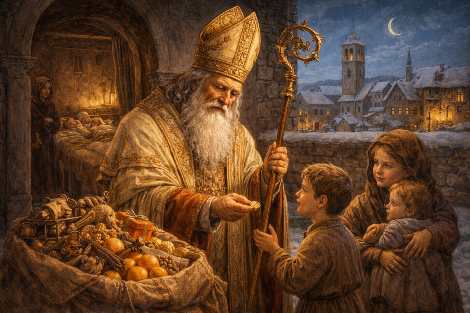 San Nicola nacque intorno al 270 d.C. nella città di Patara, un importante porto della Licia. La sua famiglia era benestante e profondamente religiosa. Secondo la tradizione, rimase orfano molto giovane, ereditando una grande ricchezza che scelse di distribuire ai poveri in segreto. È da questo gesto di carità silenziosa che nascerà una delle leggende più note: quella delle tre ragazze a cui lasciò cadere tre sacchi di monete dalla finestra di notte per salvarle dalla miseria. Questo episodio, tramandato per secoli, diventerà la base della figura generosa che in molte culture si trasformerà nel personaggio moderno di Babbo Natale.