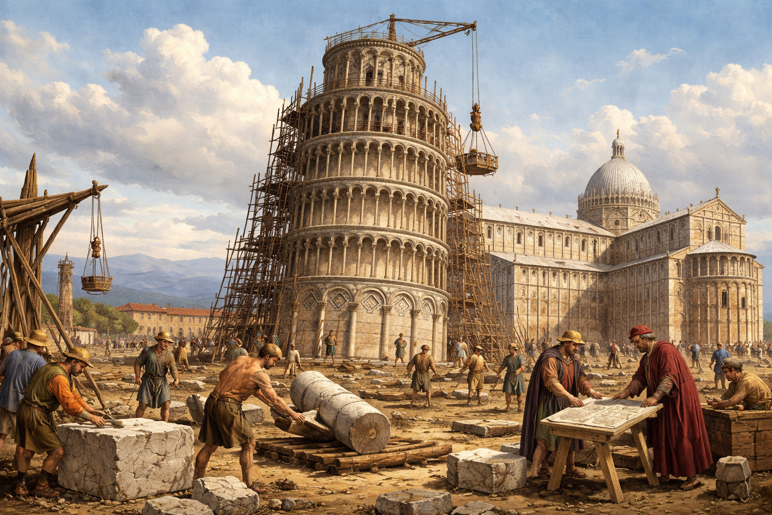 La costruzione della torre è iniziata nel 1173. All'inizio il progetto era semplice: costruire una torre alta, elegante e dritta, come molte altre torri campanarie italiane. I primi piani furono costruiti senza problemi e la torre sembrava stabile. Dopo poco tempo, però, gli architetti si accorsero che qualcosa non andava come previsto. Il terreno sotto la torre non era abbastanza solido. Pisa si trova in una zona con un suolo morbido, fatto di sabbia, argilla e terra bagnata dall'acqua. Questo tipo di terreno non era adatto a sostenere il peso enorme di una torre così grande.