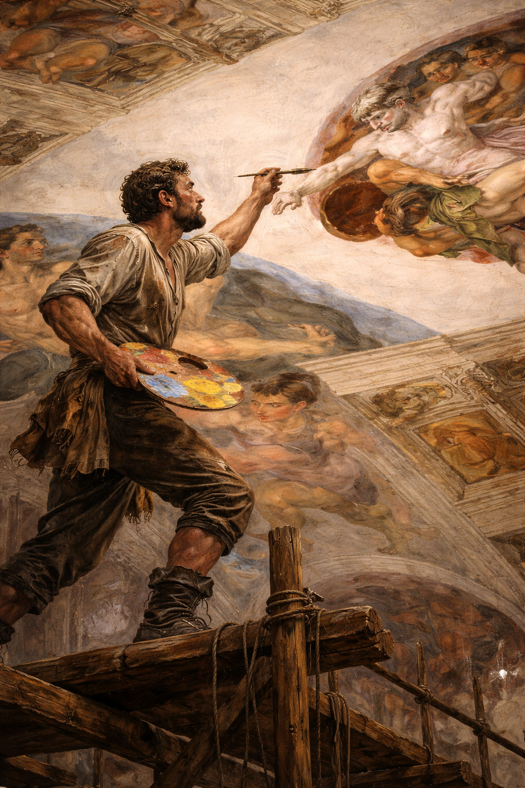 Il lavoro dura circa quattro anni, dal 1508 al 1512. Michelangelo ha tra i 33 e i 37 anni. Quattro anni che non sono semplicemente tempo, ma consumo dell'esistenza. Lavora in condizioni estreme, su impalcature progettate da lui stesso, rifiutando quelle suggerite da Bramante. Dipinge in una posizione innaturale, con il corpo piegato all'indietro, il collo forzato verso l'alto. Il gesto pittorico diventa una tortura fisica.