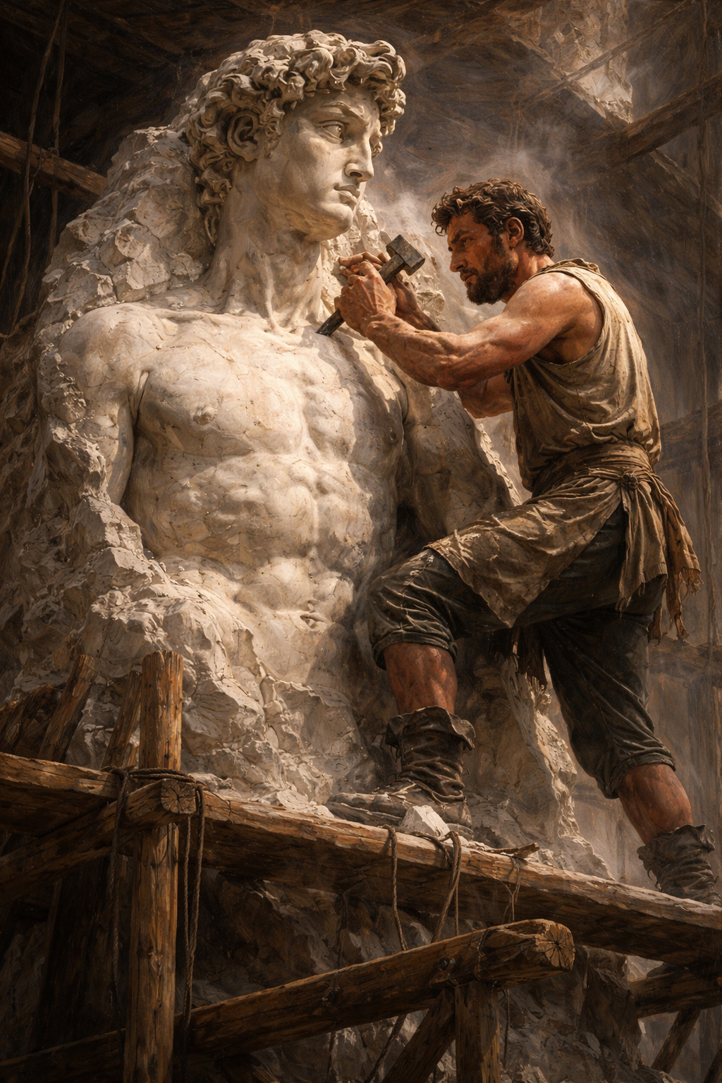 A Firenze entra giovanissimo nella cerchia di Lorenzo de' Medici. Qui non impara solo tecnica, ma entra in contatto con il pensiero neoplatonico: l'idea che la bellezza sia una forma di risalita verso l'essere. Questa visione non lo abbandonerà mai. La scultura diventa per lui un atto ontologico: la forma è già nel blocco, e l'artista è colui che elimina il superfluo. Non crea, ma rivela.