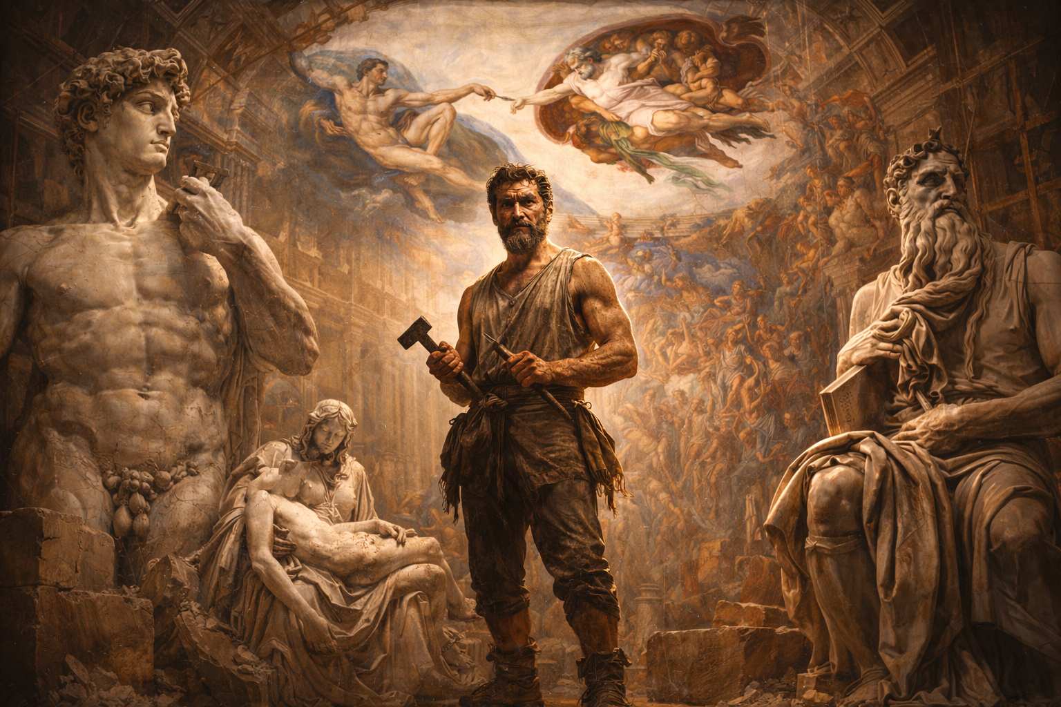 Qui emerge la frattura più violenta della sua esistenza: il conflitto con Papa Giulio II non è un semplice scontro tra artista e committente, ma uno scontro tra due volontà assolute, entrambe incapaci di cedere. Michelangelo non è un esecutore, è un principio che vuole imporsi. Giulio II non è un mecenate, è un sovrano che pretende dominio. Da questo urto nasce una delle opere più grandi della storia, ma anche una delle più profonde ferite nella vita dell'artista.