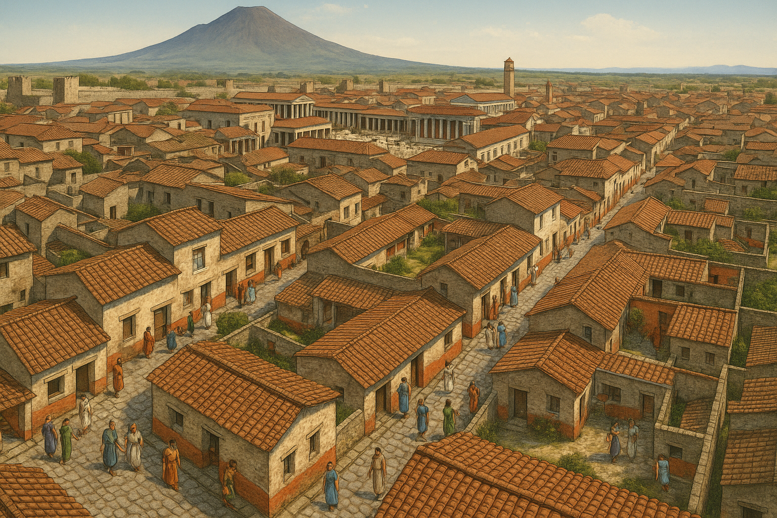 Prima della grande eruzione, Pompei era una città romana molto attiva e piena di vita. Le strade erano sempre occupate da persone che camminavano, parlavano, compravano e vendevano. C'erano mercati ricchi di frutta, pane, vino e spezie. Le case erano decorate con colori forti e con belle pitture sui muri. C'erano giardini, fontane e piccole statue che rendevano gli ambienti eleganti e luminosi. La gente si incontrava nelle piazze, andava alle terme e partecipava agli spettacoli del teatro. Pompei era una città viva, con tradizioni, feste e un ritmo quotidiano tranquillo e armonioso.