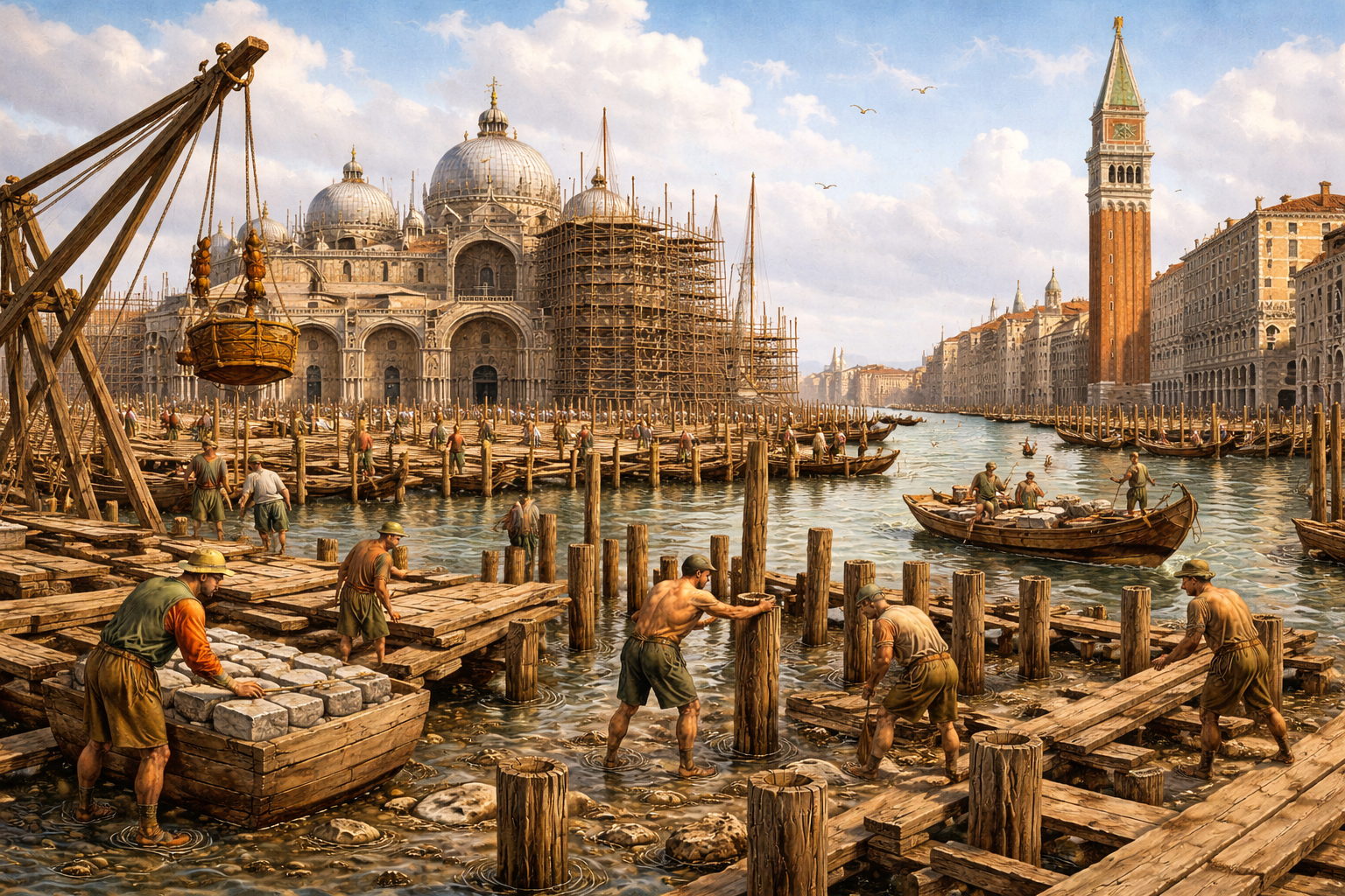 La vera domanda rimane: come è possibile costruire una città in mezzo all'acqua? La risposta si trova nella straordinaria tecnica costruttiva che i veneziani svilupparono secolo dopo secolo. L'elemento fondamentale fu il legno, ma non un legno qualsiasi: tronchi di larice, quercia e ontano, resistenti all'acqua e capaci di indurirsi in ambiente anaerobico. Prima di costruire una casa, i veneziani piantavano migliaia di pali nel fondale della laguna, fino a raggiungere uno strato compatto di argilla. I pali, compressi uno accanto all'altro, formavano una piattaforma stabile. Sopra questa base si posavano tavolati e poi lastre di pietra d'Istria, una roccia chiarissima e molto resistente alla salsedine. Su questa base, infine, si poteva costruire tutto: case, palazzi, chiese, campanili.
